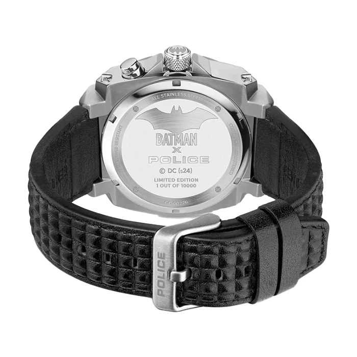 محصول سفارشی سازی شدهی شخصیت بتمن کمپانی دی سی با شرکت پلیس ایتالیا؛ساعتی با بدنهای نقرهای رنگ ،کوسنی شکل و از جنس استیل ضدزنگ که با بند چرم مشکی بافت دار طراحی شده است.